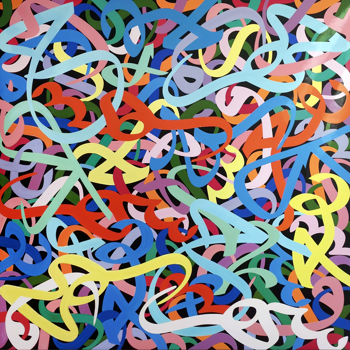 A maze of rose-toned strokes overlaps like petals scattered in the wind. The rich layers of looping, curved shapes resemble an abstract bouquet in motion. This piece blends passion and softness, using its warm palette to evoke themes of love, complexity, and the delicate tensions that bind them.